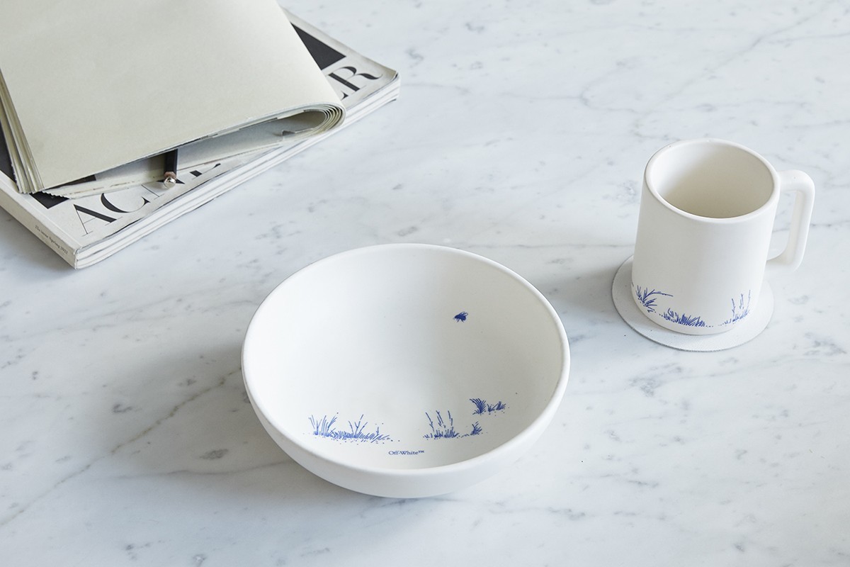 该系列的品项众多,包括大大小小的餐盘、碗、咖啡壶、咖啡杯、马克杯、玻璃杯、烟灰缸、置物盘等,而设计以矢车菊蓝为主题,并且搭配Off-White Logo字样。