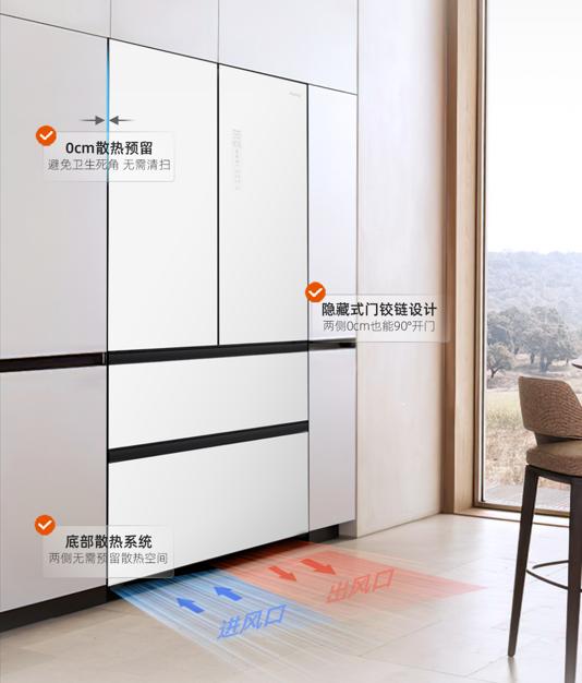 奥马539阿尔卑斯白作为一款全嵌超薄冰箱,它整机纵深只有640mm,而且采用了隐藏式的门铰链和无需预留散热空间的创新设计,在保证了美观的同时,实现零距离全嵌入,可以更加灵活地适配厨房空间,完美融合于各种风格的家居中。