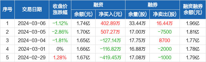 融资方面,当日融资买入929.04万元,融资偿还526.15万元,融资净买入402.89万元。融券方面,融券卖出16.77万股,融券偿还3300股,融券余量33.44万股,融券余额2191.4万元。融资融券余额合计1.96亿元。