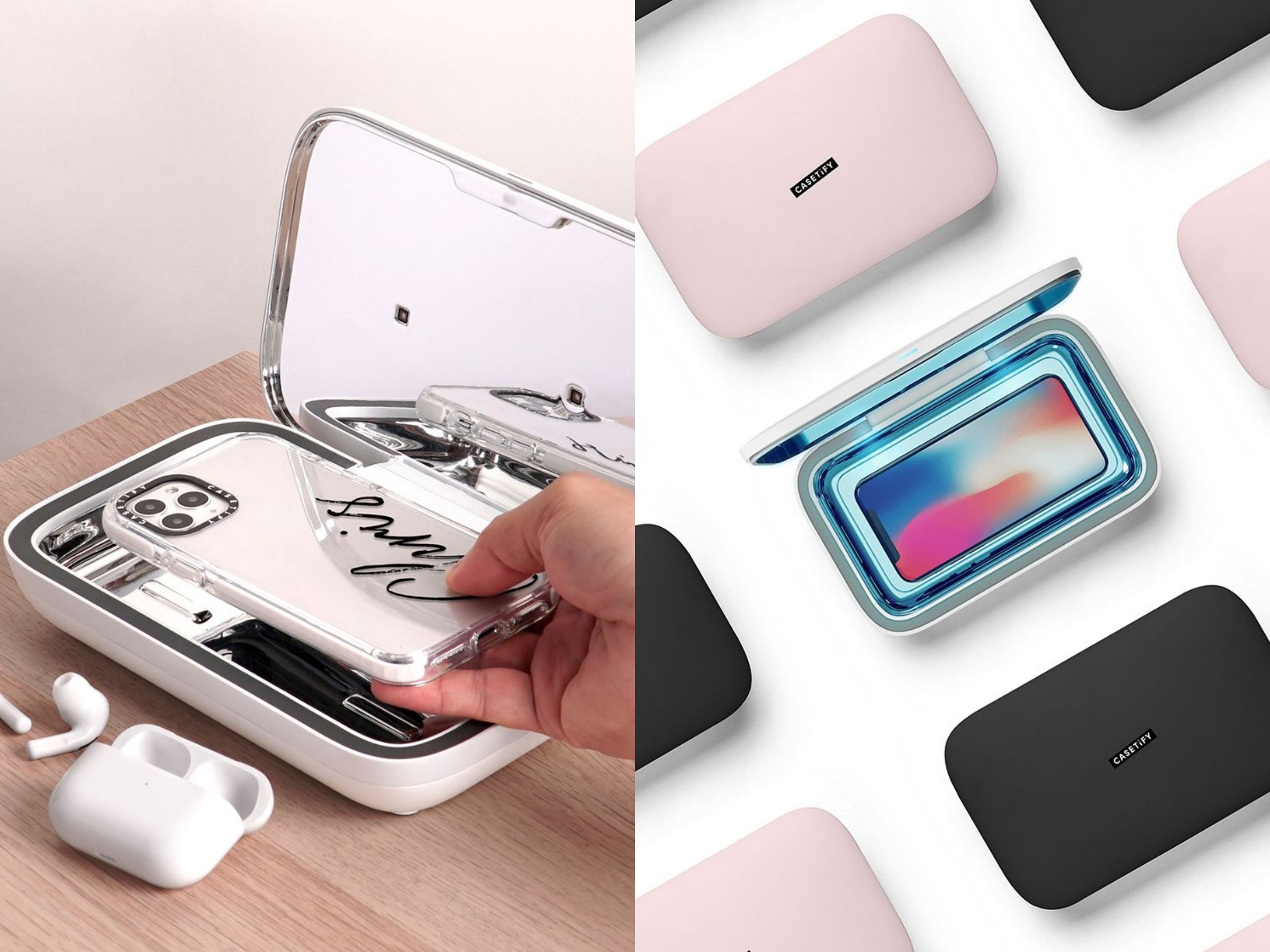 3C周边品牌CASETiFY推出的“UV手机消毒器”,利用紫外线照射可消灭99.9%的细菌,同时能替手机无线充电,手机之外也可以消毒任何随身物品,素面的外型很简约有质感,共有黑、白、以及今年推出的全新嫩粉红色选择,分为大、小尺寸,大的3分钟可完成消毒,小的则需6分钟。(目前尚未有科学研究证实采用的UV-C光可以杀灭COVID-19病毒,但UV消毒机能有效杀灭99.9%的常见家居细菌。)