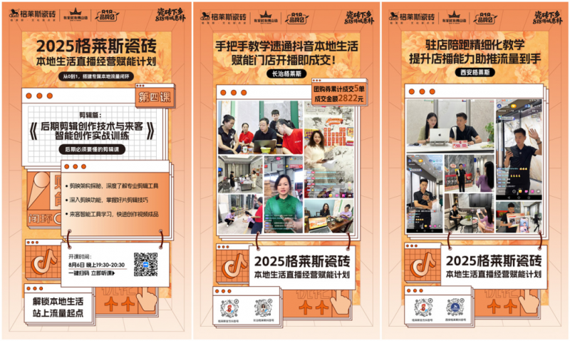 品牌总部以身作则,总经理黎汝让“黎叔讲瓷砖”账号开通,以90条视频近百万曝光吸引终端经销商老板以及导购纷纷效仿建立新媒体矩阵,超100家格莱斯终端门店入驻抖音本地生活。今年“818品牌日”期间,格莱斯全新“下沉市场+新媒体赋能”模式实战落地,实现了单个门店留资加微信率62%的标杆记录。