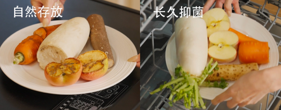 经过5天的放置以后,再来看这些水果,真的是天差地别。在室内静置的水果蔬菜已经发霉,还有一股淡淡的发酵味。而从洗碗机内拿出来的水果除了看起来水份略有流失以外,整体并没有发霉,状态良好。