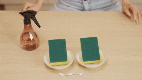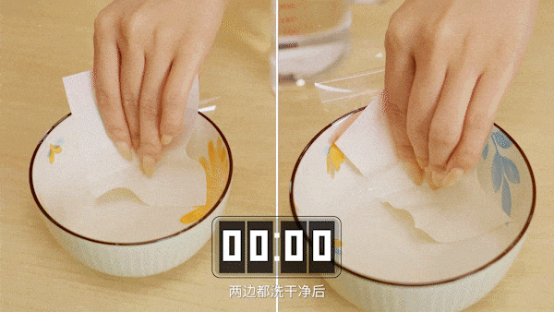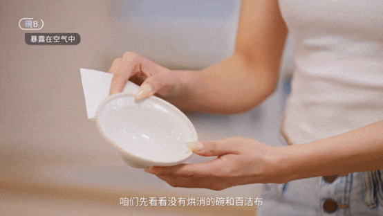 随后,把其中一块百洁布和碗,放入洗碗机并开启独立烘消。另一块百洁布和湿碗,就放在台面上自然风干。稍等片刻之后,对比烘干效果。