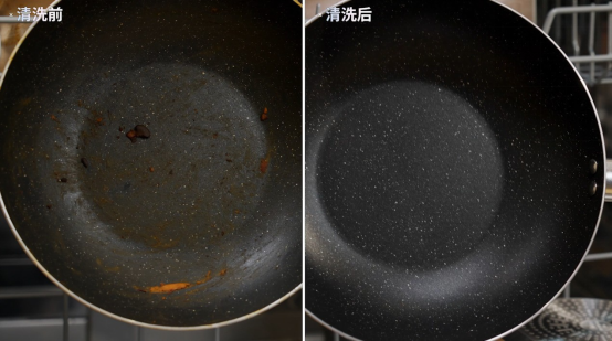 第二次清洁,友嘉将要挑战三个炒锅!友嘉灵晶空气除菌洗碗机拥有20 套容量的“大肚量”,应付三口锅也不在话下,轻轻松松放进去,直接开洗。等待片刻清洁完成后取出来,仔细翻看,可以看到没有残留的污渍,连手柄上的脏污也被完全清洗干净,清洁效果完美。