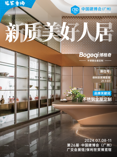 7月8日至7月11日,欢迎前来广州建博会,广州保利世贸博览馆——21.1-07号,博格奇不锈钢全屋定制展位,亲自体验融合了不锈钢定制原创设计、美学、艺术与技术的“新质美好人居”360°沉浸式浪漫家居空间!