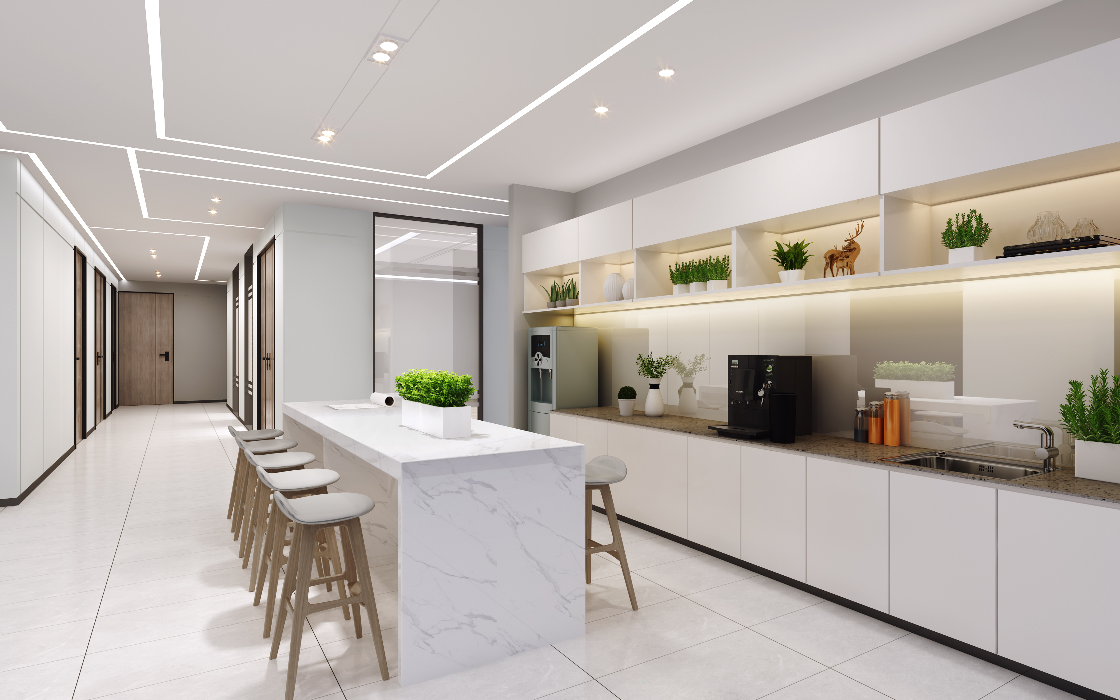 渲维设计团队在需求调研阶段,通过员工动线热力图分析发现:研发部与产品部协作频次高达每日23次,但原方案将两部门分置办公区两端。优化后,将高频协作部门调整至相邻区域,使部门沟通时间缩短40%。同时,采用企业品牌蓝作为主色调,在前台、会议室、休息区植入科技感线条元素,强化品牌辨识度。