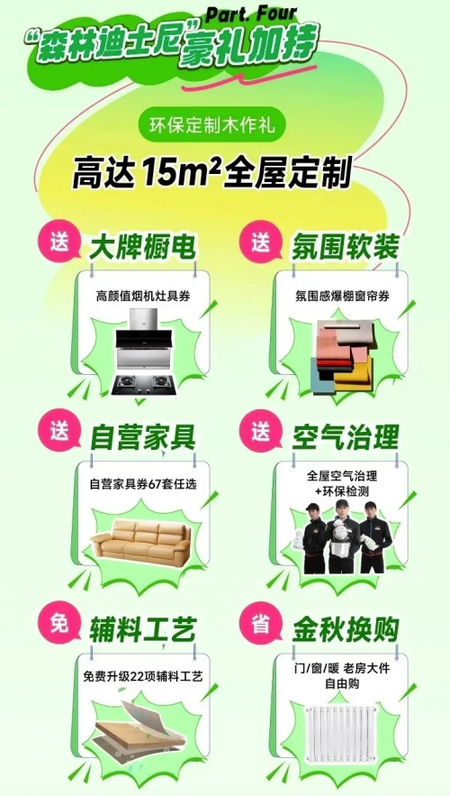 不仅如此,活动还精心策划了森林寻宝之旅,参与者通过签到和各种互动游戏,有机会赢得丰厚奖品,包括定制礼品袋和小家电等,让每个人都能带着惊喜回家。活动现场的“好礼加持”环节同样不容错过。豪华赠品如大牌厨电、氛围软装、自营家具等应有尽有,并且提供了空气治理、免费辅料工艺和金秋换购等多重优惠,为消费者提供了一站式的家装解决方案。